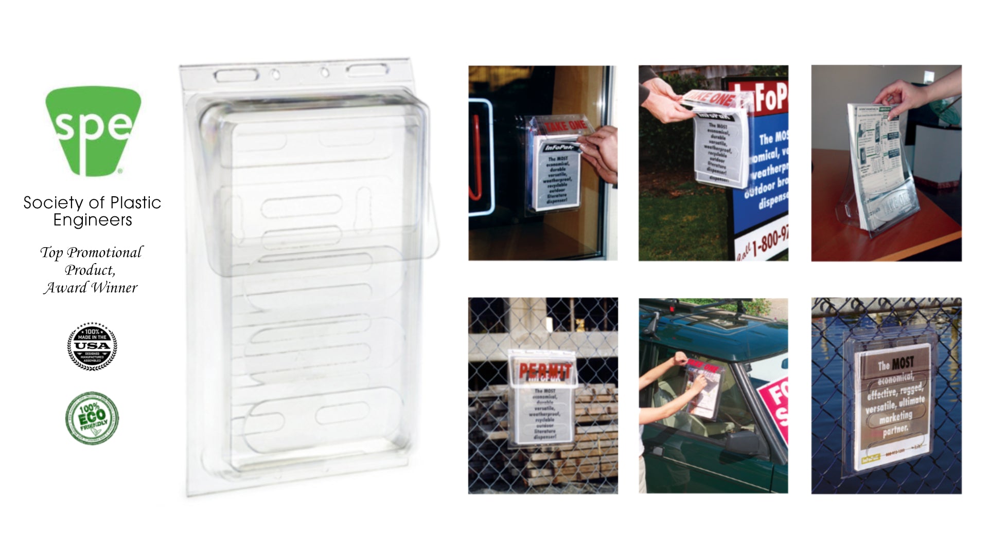 Utilizing a unique, patented manufacturing process (100% Made In USA), our line of “Eco-Friendly” products are engineered to be weather resistant, see-thru, versatile and best of all… inexpensive! It seems the critics agree: The Society of Plastic Engineers has awarded the honor of “Top promotional product design” to the InFoPaK JR.